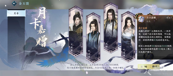 月卡内容:购买立即获得300纹玉和20000铜钱,之后每日登录额外获得100纹玉(绑)以及朝夕赠礼。